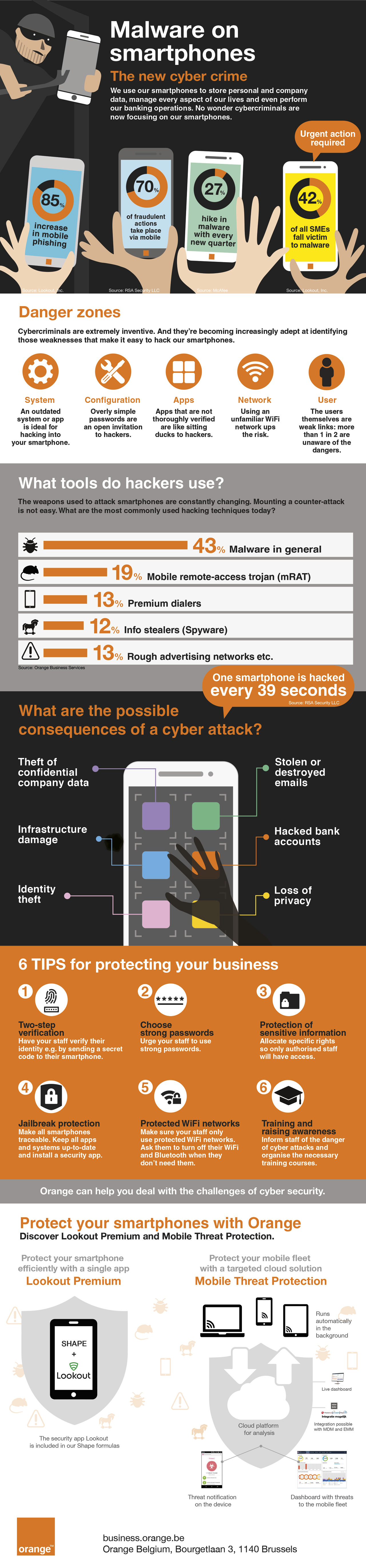 Orange puts a stop to this new form of cyber crime by including the mobile security app Lookout Premium as part of every Shape subscription. This app scans your mobile device and your data and alerts you when a possible threat is detected.