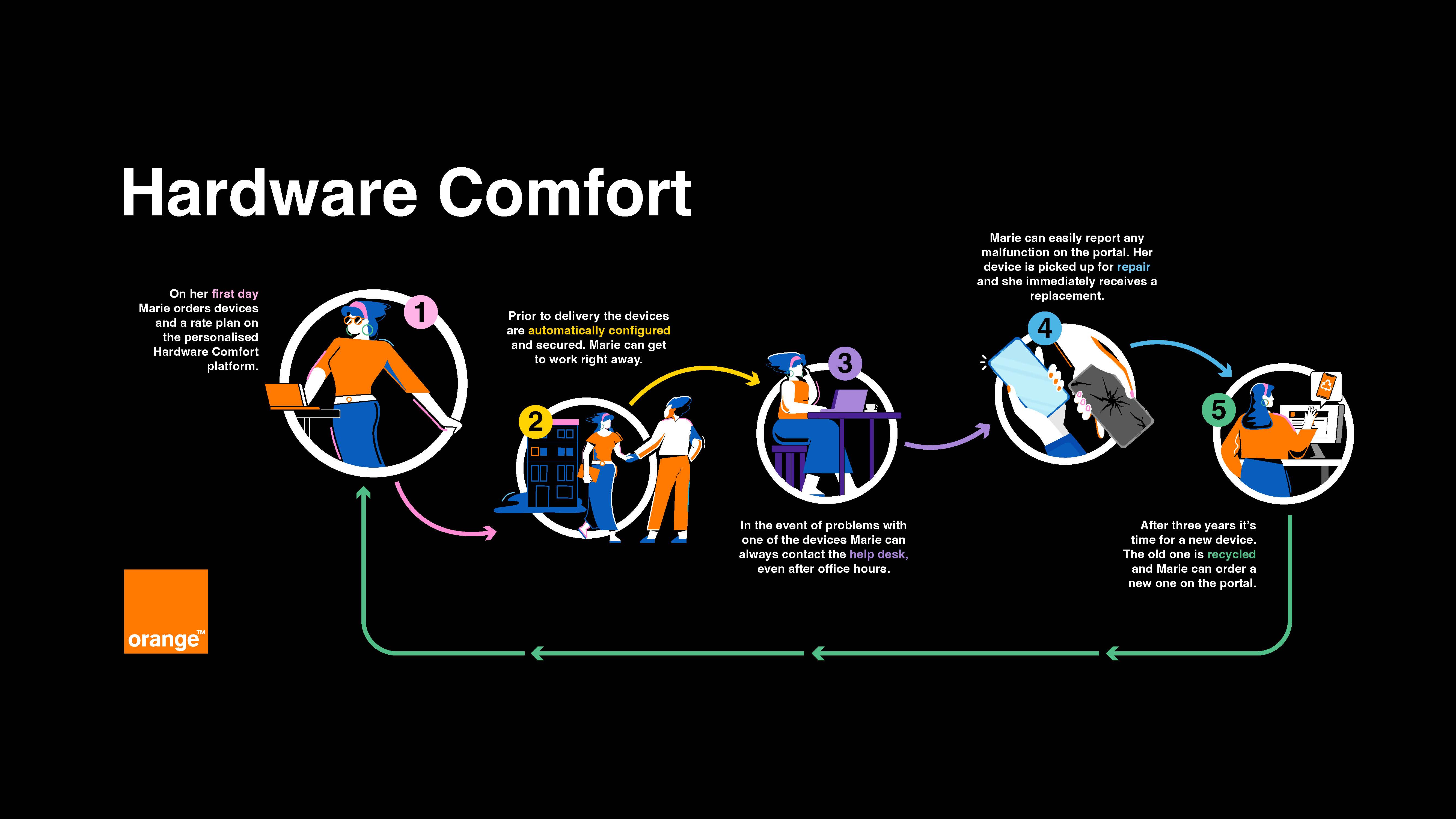 For companies that are confronted with the downside of hybrid working, we’ve created the Hardware Comfort solution. With Hardware Comfort, we manage the entire life cycle of your devices, from purchase and installation to repairs and recycling.