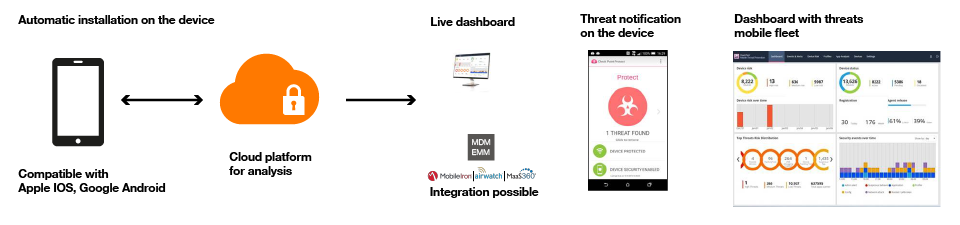 Integration with a Mobile Device Management solution ensures that the threat is not only detected and displayed on the device of your employee and in the dashboard of your fleet manager, but also immediately blocked by your Mobile Device Management application. If desired, Orange Cyberdefense can supervise the integration of the Mobile Threat Protection solution with your Mobile Device Management solution.
