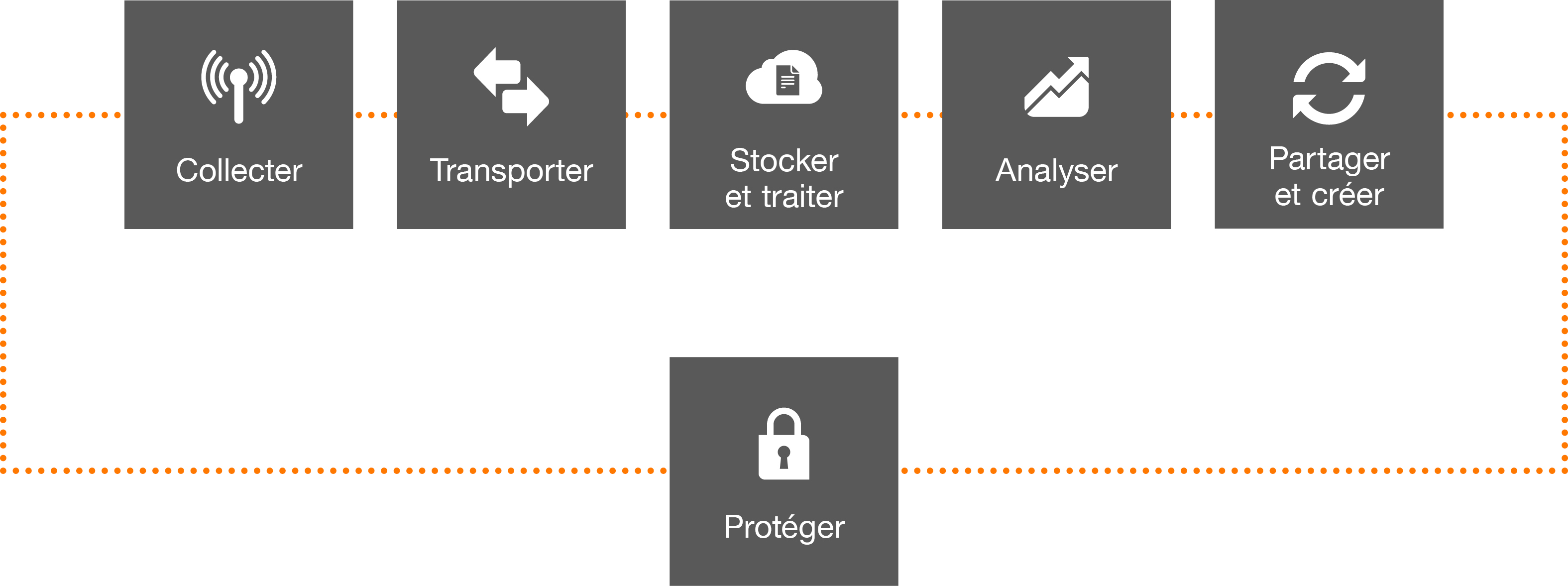 Vous pouvez ensuite structurer efficacement les investissements dans les quatre domaines grâce au data journey. Un data journey complet commence par la collecte des données, par exemple via l’IoT, et se poursuit par le transfert, la sauvegarde, le traitement, l’analyse, le partage et la création de ces données. À cet égard, la sécurité est la pierre angulaire de la stratégie. “Le data journey et son approche graduelle ont déjà démontré leur utilité. Cette approche est vraiment rentable pour les organisations.” Orange accompagne les entreprises à chaque étape de leur data journey et contribue à trouver la solution sur mesure la mieux adaptée aux besoins de chaque entreprise.