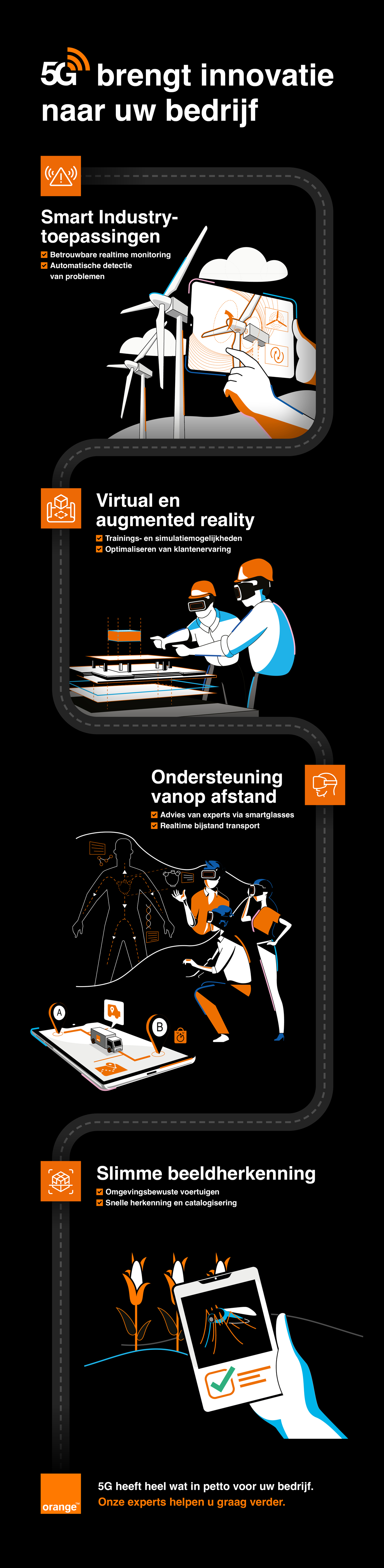 Het is duidelijk dat 5G meer is dan een technologie: het is de weg naar de toekomst. In 2019 lanceerde Orange als eerste mobiele operator in België een standalone 5G-netwerk in de Antwerpse haven. Sindsdien hebben we talloze bedrijven ondersteund in hun digitale transformatie. Onze experts staan klaar om ook uw bedrijf te begeleiden in het 5G-tijdperk.