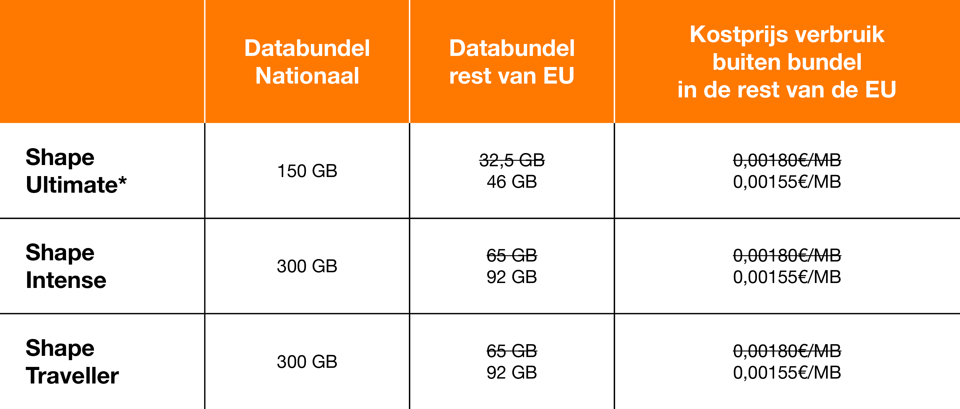 Vanaf 03/12/2023 ontvangt u bij Shape Ultimate, Intense of Traveller heel wat extra data in de Europese Unie. Gebruikt u meer data dan uw bundel toelaat? Dan betaalt u vanaf die datum ook minder per verbruikte MB.