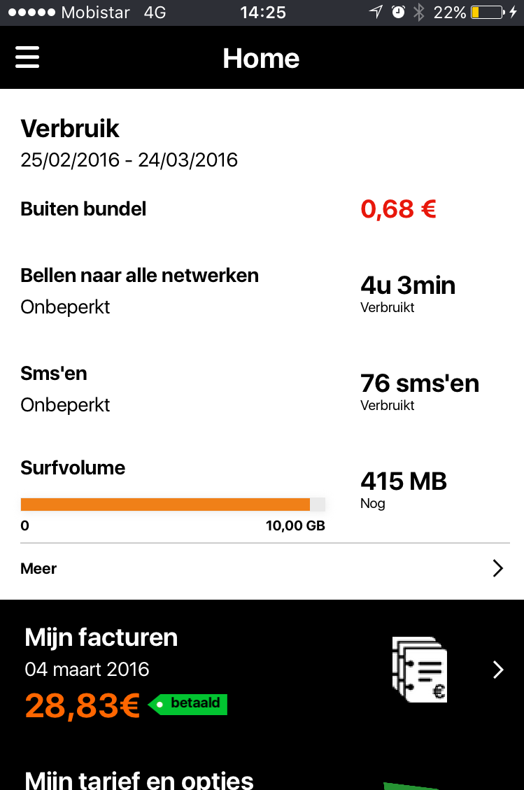 - De My Orange-applicatie, die u een overzicht geeft van de oproepen naar alle netwerken, het sms- en dataverbruik, eventueel bijkomende kosten.